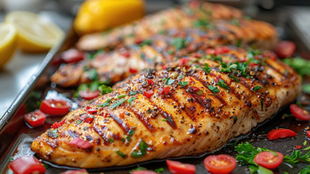 A beautifully plated grilled salmon fillet garnished with fresh herbs and lemon slices, resting on a wooden cutting board with a vibrant vegetable medley.