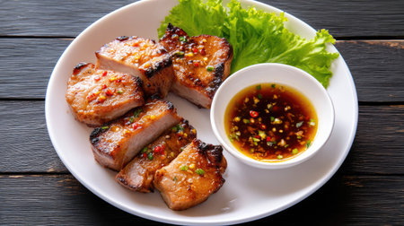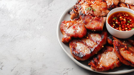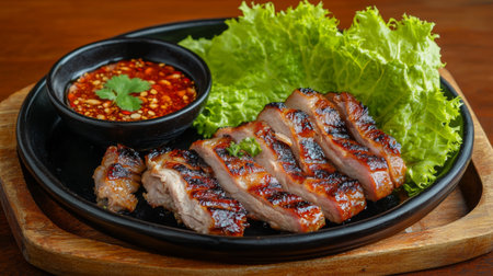 A mouthwatering platter of grilled pork slices served with a side of spicy dipping sauce, garnished with fresh herbs, perfect for culinary enthusiasts and food lovers.