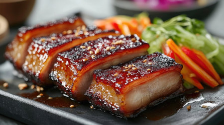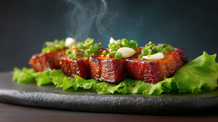 Savory glazed pork belly served on a black platter, garnished with fresh herbs and captured in warm light, perfect for food promotion and culinary art.