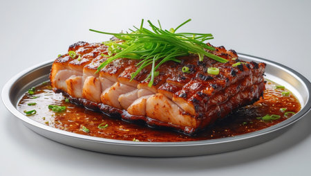 AI Generated. Delicious grilled pork belly served on a sizzling platter with green onions