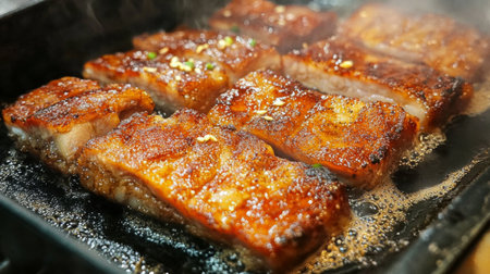 An artistic shot of pork belly slices sizzling in a pan, with golden-brown edges and aromatic herbs, highlighting the cooking process and delicious aromas.