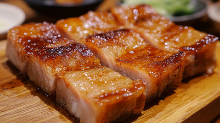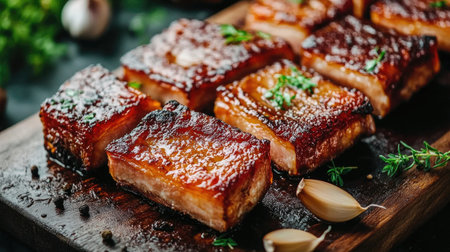 A tempting grilled pork belly dish served on a wooden platter, showcasing its crispy texture and rich flavor, perfect for food lovers and chefs.