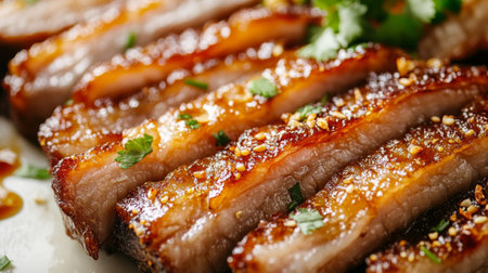 Succulent glazed pork belly slices arranged on a wooden platter, garnished with vibrant chopped herbs. Ideal for showcasing delicious culinary creations.