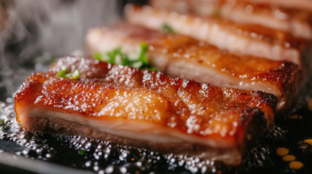 Savory grilled pork belly slices, perfectly caramelized and garnished with herbs and sesame seeds, ideal for adding a flavorful touch to any dish or meal.
