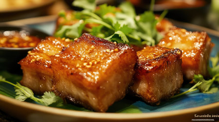 Enjoy a mouthwatering plate of crispy pork belly garnished with fresh herbs and sesame, perfect for any culinary enthusiast or special occasion.
