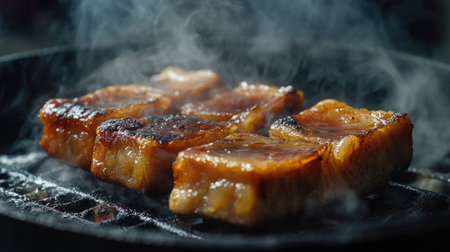 Close-up of grilled pork belly sizzling on a charcoal grill, exuding steam and rich flavors. Perfect for food lovers seeking savory cuisine inspiration.
