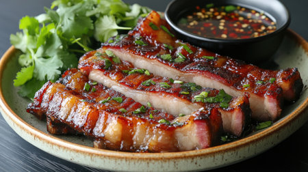 A beautiful close-up of roasted pork belly served on a plate, garnished with herbs and accompanied by a dipping sauce, highlighting its rich texture