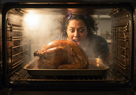 A woman with an expression of surprise and possibly slight fear leans into an oven filled with steam from a roasted turkey. Generative Ai