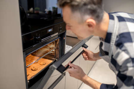 Man looking into open oven at baking cookie