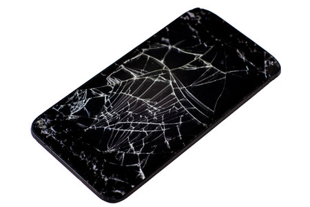 Broken phone screen on a white background. Many cracks on the black touchscreen of the phone.