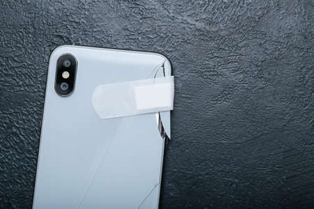 Broken mobile phone with medical plaster on dark background, closeup