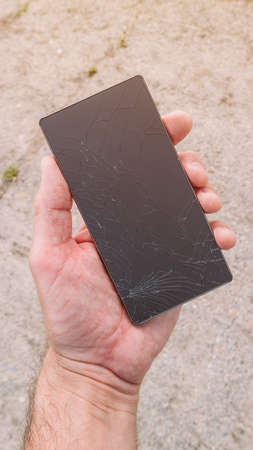 Man holding a broken mobile smart phone in hand, close up with selective focus