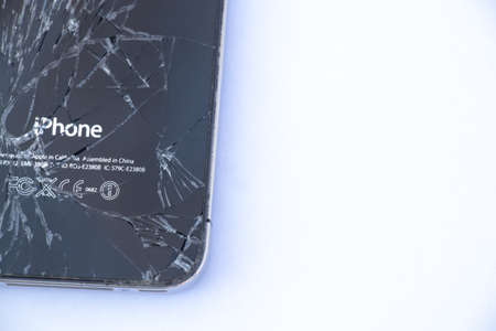 Ukraine, Dnipro - April 03, 2020. An old broken iPhone 4 lies on a white background