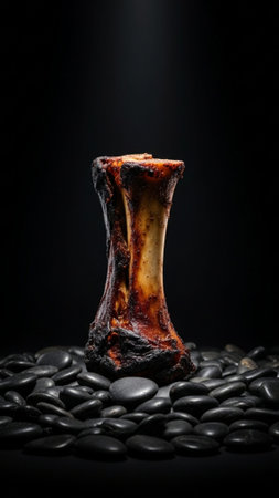 The flat animal bone (shoulder blade) with cut meat lies on black asphalt