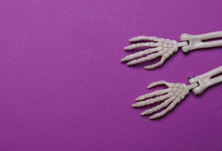 Halloween decoration concept. Plastic skeleton hands on green purple background