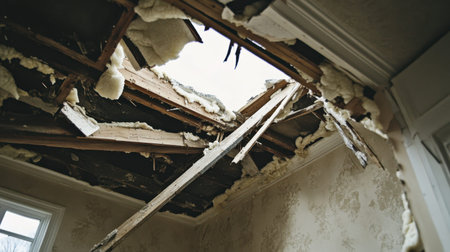This image showcases significant damage to a ceiling in a residential property, revealing exposed beams, insulation, and signs of moisture intrusion.