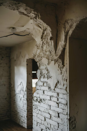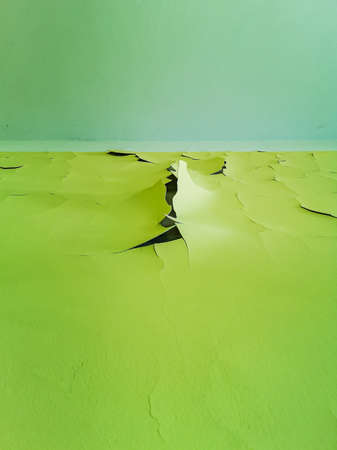 A damaged wall displays extensive peeling paint and cracks revealing a rough surface underneath. The scene conveys neglect and age.