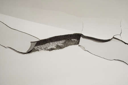 Closeup on a crack in a white ceiling of a generic, unidentified old house, resulting from water leak, showing a bulged panel that in danger of falling off