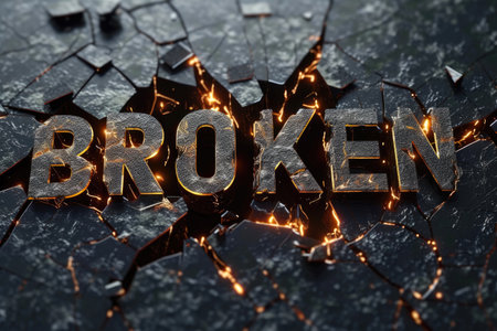 the word broken is assembled from letters of red cubes on broken glass. cracks in black glass