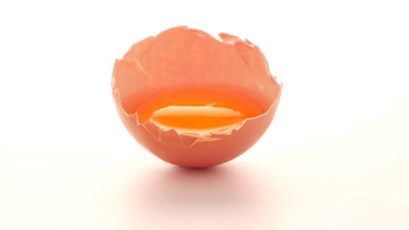 Broken egg on top against white background.