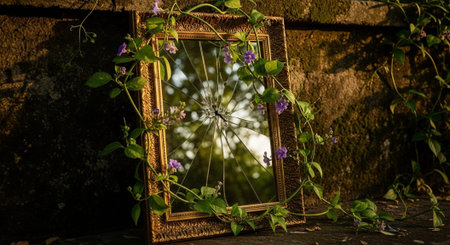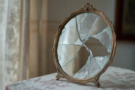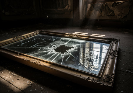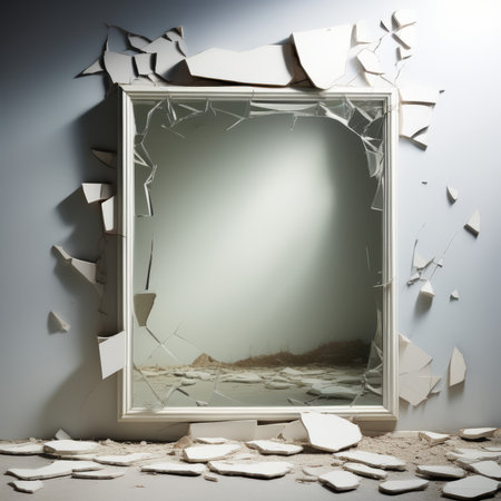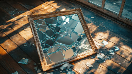 The fragments of a broken mirror lie on the floor. Vertical photography.