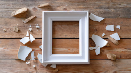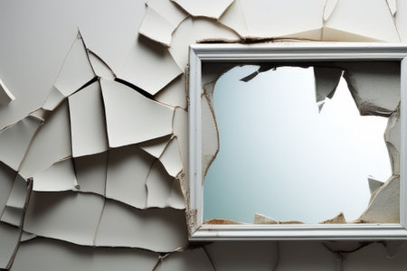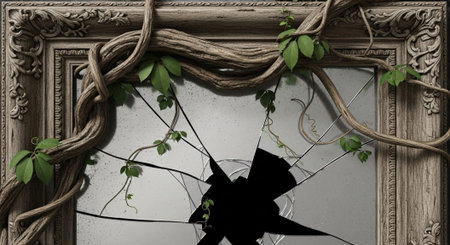 Broken window glass with wooden vintage frame around