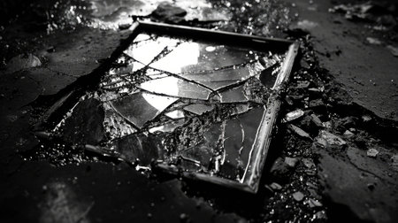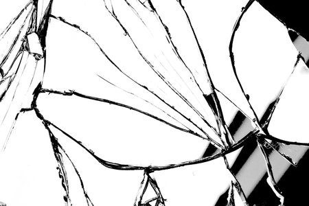 Shattered glass against a black backdrop is shown.