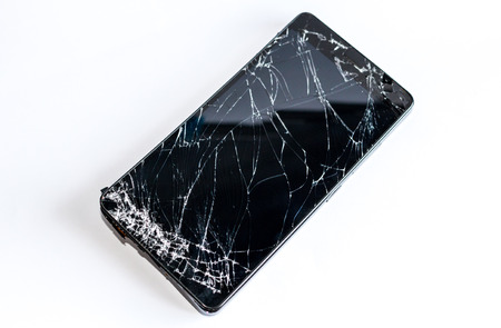 Broken phone screen on a white background. Many cracks on the black touchscreen of the phone.