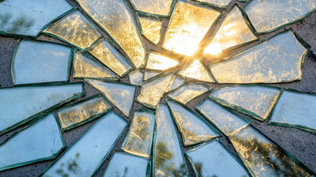This captivating image showcases shards of broken glass beautifully reflecting sunlight, creating an abstract and vibrant design. The interplay of light and texture adds an artistic touch, perfect for creative projects or nature-themed designs.
