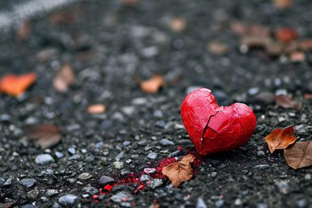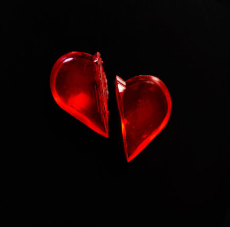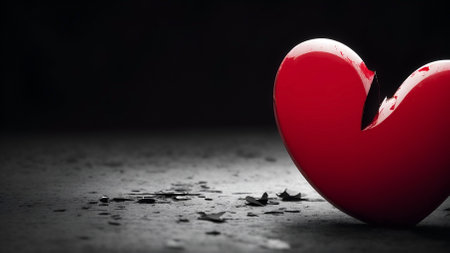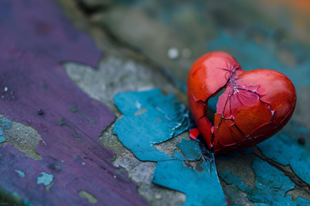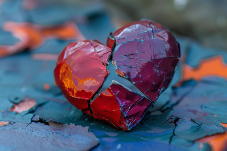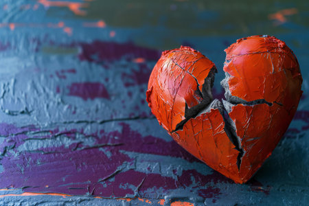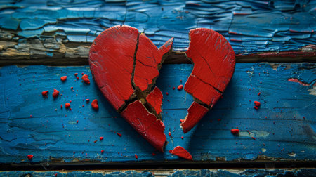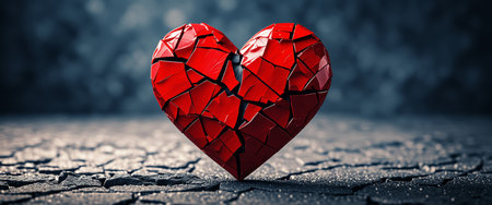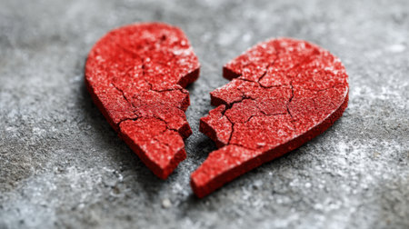 A striking red heart shape broken in two pieces is placed on a rough gray surface. This visual captures the essence of heartbreak, sadness, and emotional pain, evoking strong feelings.