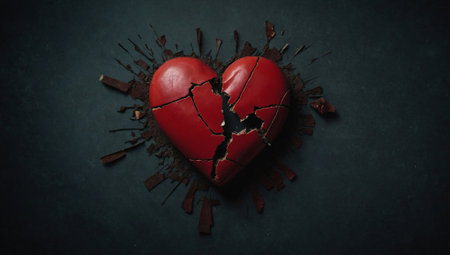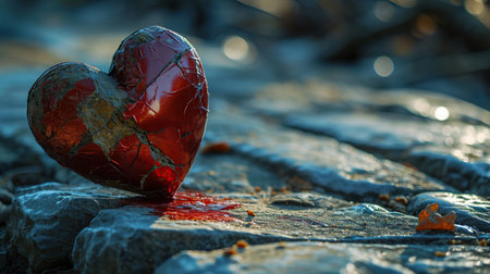 A striking image of a cracked red heart sculpture set against rough stones, symbolizing love and loss. The soft focus background enhances the emotional depth.