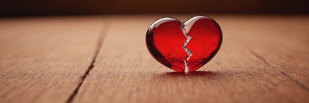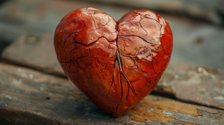 Cracked red heart symbol on dark wooden background for emotional and relationship concepts