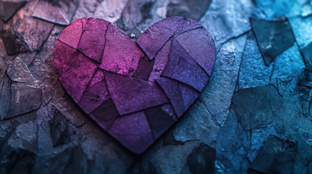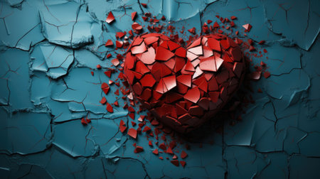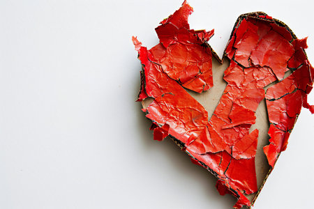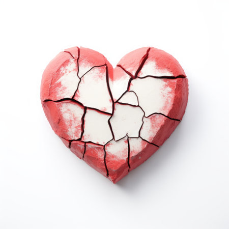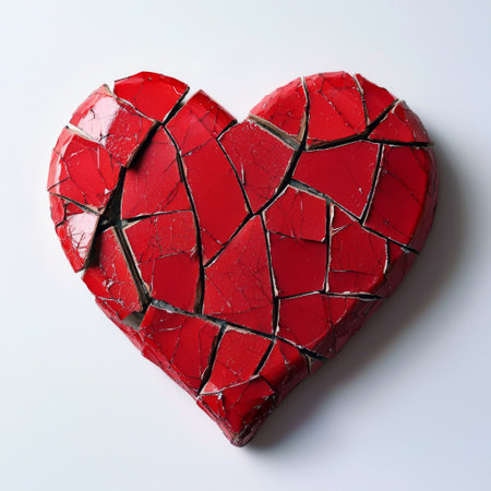 A striking representation of a broken heart crafted from fragmented red ceramic pieces, showcasing the beauty and pain of emotional struggles in relationships.