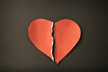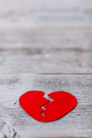 Broken two heart breakup concept separation and divorce. Red crumpled paper shaped as a torn love on old wood.