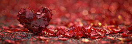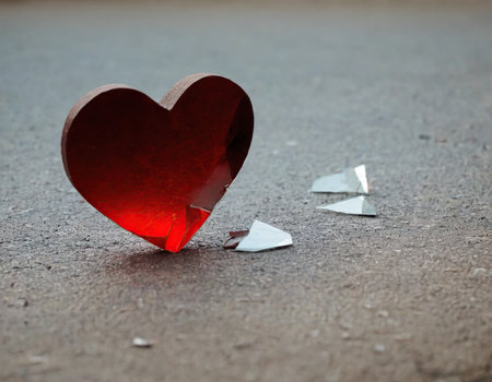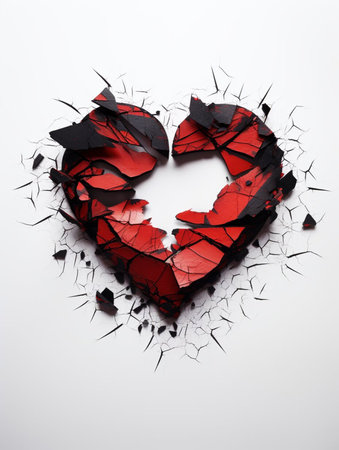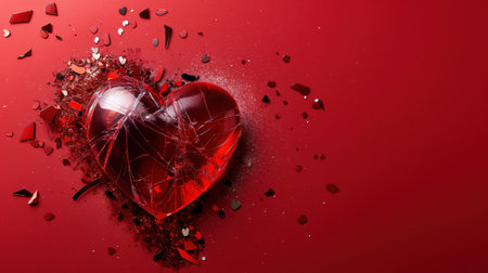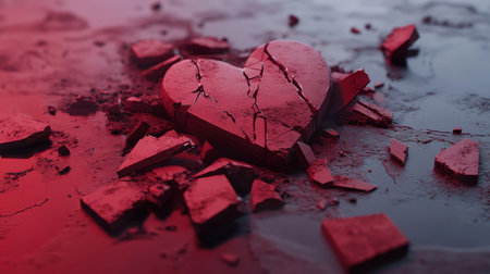 A broken heart, shattered into pieces, symbolizing the pain and sorrow of a lost love. The dramatic red hues enhance the emotional intensity.
