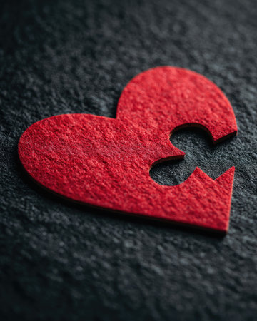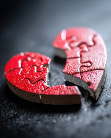 A close-up view displays a fragmented heart shape formed from red wooden puzzle pieces. The pieces rest against a dark, textured background. The image exhibits a shallow depth of field, with soft lighting and a focus on the textured surface and edges. Suitable for illustrating themes of relationships or emotional concepts.