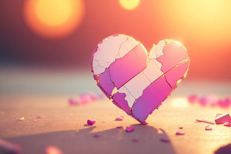 A stunning image of a shattered glass heart with a glowing light at its center. The bokeh background adds a dreamy atmosphere, enhancing the emotional impact.