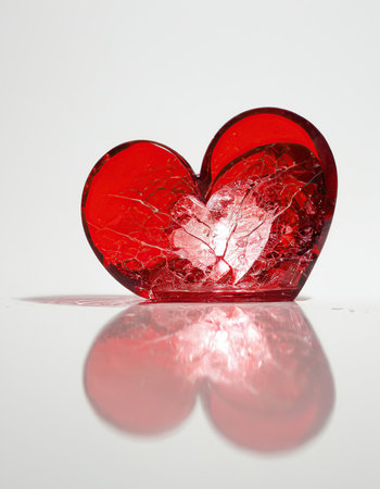 A broken red heart on a white surface. Generative AI. Broken heart.