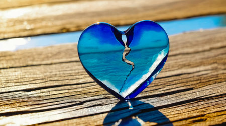 Blue Glass Heart Broken in Half on Wooden Background, Symbolizing End of Love, Emotional Pain, Heartbreak, Divorce, Separation, Sadness, Loss
