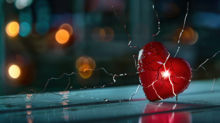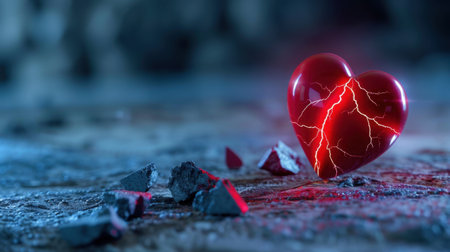 This striking image captures a bright red heart, charged with lightning, resting on broken ground, symbolizing passion and emotional intensity amid darkness.