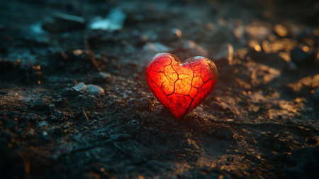 Fiery red heart emerging from a dark, cracked ground, representing passion. generative ai