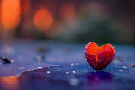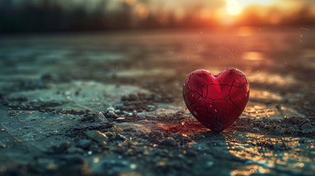 A cracked red heart rests on the ground at sunset, symbolizing deep emotional pain