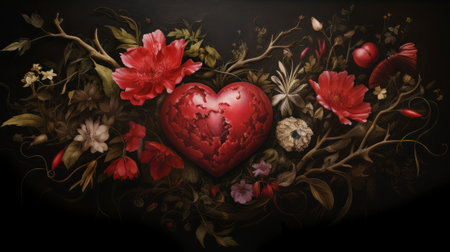 Painterly art illustration of a heart surrounded by flowers, grasses, and leaves, with dark moody light, inspired by Baroque and Dutch Golden Age art styles