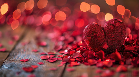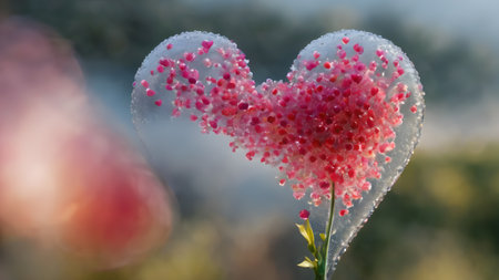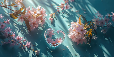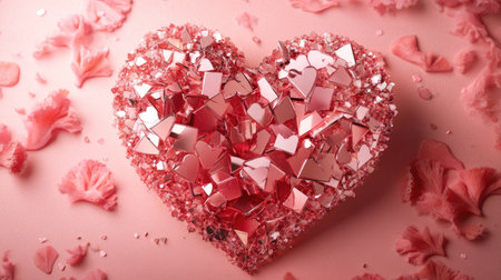 Beautiful heart shape made of shiny pink mirror pieces surrounded by delicate petals, perfect for romantic themes, celebrations, or artistic designs.