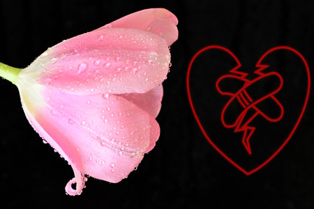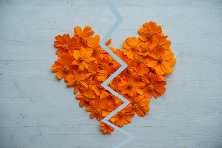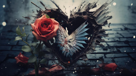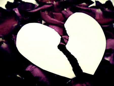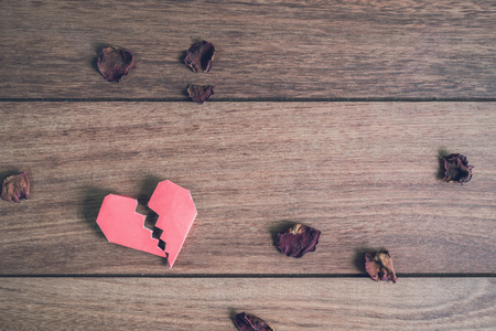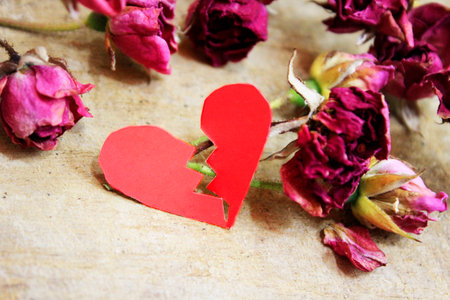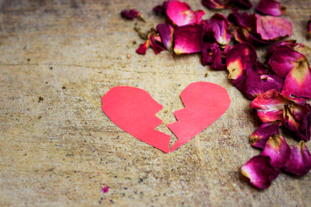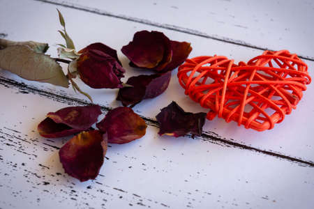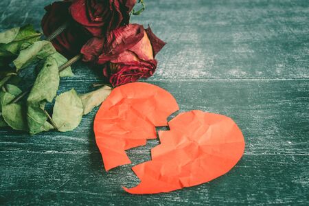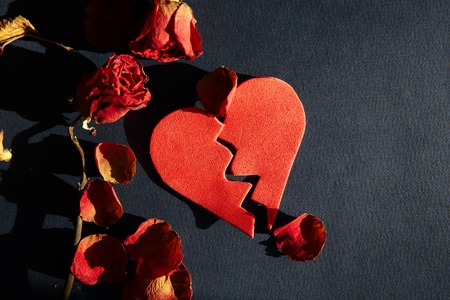 Broken heart and withered rose petals. Lost love and broken heart emotions concept.