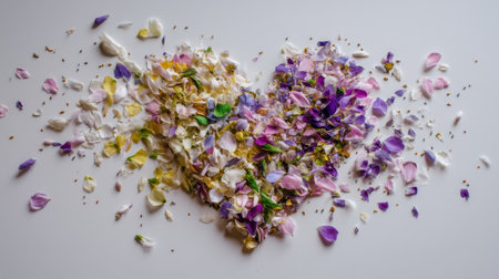 A heart shape crafted from an array of colorful flower petals on a soft white surface, ideal for themes of love, nature, and celebrations in photography.