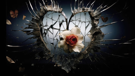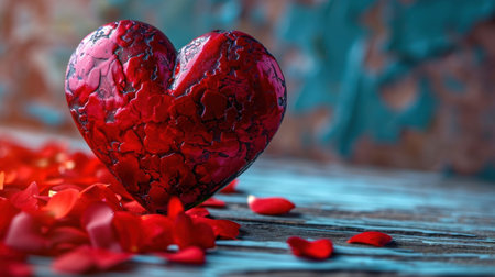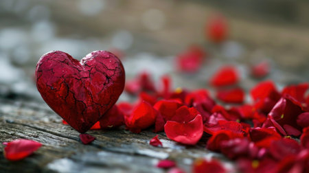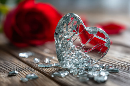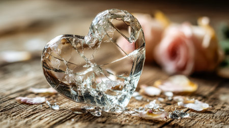 Shattered crystal form shaped like a heart rests amid delicate rose petals on weathered wooden planks, evoking themes of loss, fragile love, and vintage romance.