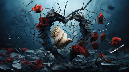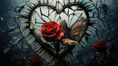 A shattered crystal heart lies amidst crimson roses, evoking feelings of heartbreak and longing, with a soft blurred floral background enhancing the melancholy mood.