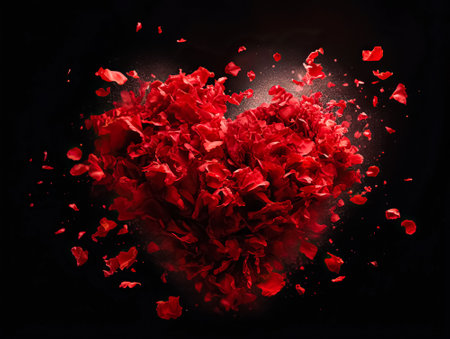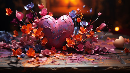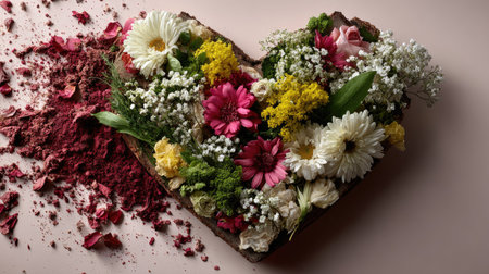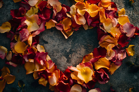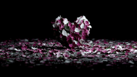A stunning heart shape formed from colorful flower petals rests on a dark surface, creating a romantic and intimate atmosphere. Perfect for love themes.