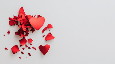 Shattered red hearts scattered on a light background representing broken love and heartbreak during a thoughtful moment